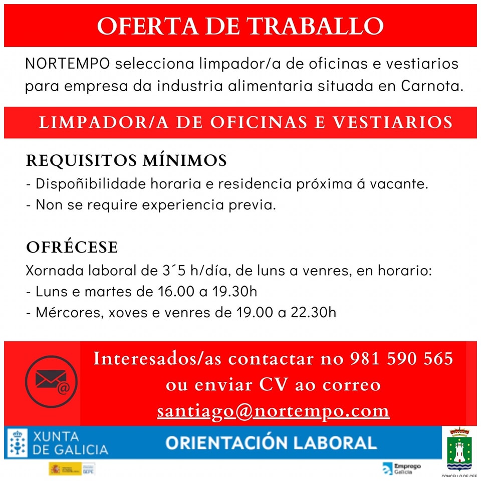 NORTEMPO selecciona limpador/a de oficinas e vestiarios para empresa da industria alimentaria sita en Carnota.
