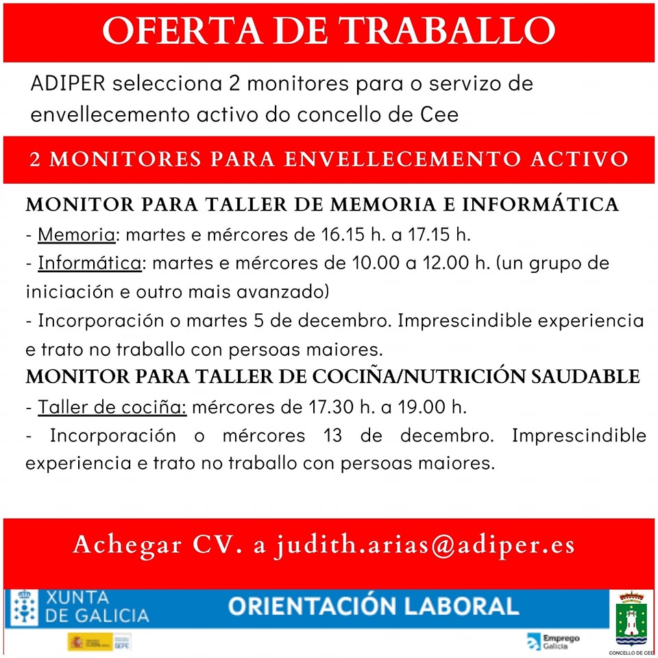 ADIPER selecciona 2 monitores para o Servizos de envellecemento activo en Cee.